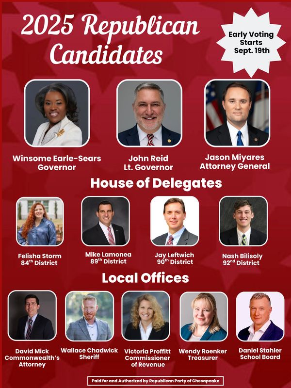 Authorized and paid for by the Chesapeake GOP. Not paid for or authorized by any candidate or candidates committee. Donations to our party are not tax deductible and may be subject to campaign finance reporting laws.